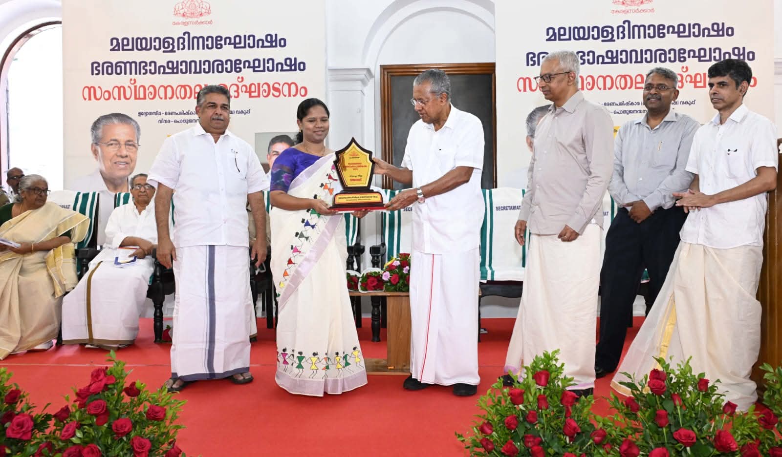 തിരുവനന്തപുരം: ഭരണ സംവിധാന രംഗത്തെ വിവിധ മേഖലകളിൽ മലയാളഭാഷ ഉപയോഗം സാർവത്രികമാക്കിയതിനുള്ള സംസ്ഥാന സർക്കാരിന്റെ ഭരണഭാഷ പുരസ്കാരം തിരുവനന്തപുരം ദർബാർ ഹാളിൽ നടന്ന മലയാള ദിനാഘോഷത്തിൻ്റെയും ഭരണഭാഷ വാരാഘോഷത്തിൻ്റെയും സംസ്ഥാനതല ഉദ്ഘാടനത്തിൽ മുഖ്യമന്ത്രി പിണറായി വിജയനിൽ നിന്നും ഏറ്റുവാങ്ങി. ഇരുപതിനായിരം രൂപയും ഫലകവും പ്രശസ്തി പത്രികയുമാണ് പുരസ്കാരം.