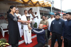 കൽപ്പറ്റ: വയനാട് ജില്ലാ പോലീസ് അത്ലറ്റിക് മീറ്റിന് മാർച്ച് പാസ്റ്റോടെ മരവയലിലുള്ള എം.കെ. ജിനചന്ദ്രന് മെമ്മോറിയല് ജില്ലാ സ്റ്റേഡിയത്തില് വർണാഭ തുടക്കം. പട്ടികജാതി പട്ടികവർഗ ക്ഷേമ വകുപ്പ് മന്ത്രി ഒ.ആർ. കേളു അത്ലറ്റിക് മീറ്റ് ഉദ്ഘാടനം ചെയ്ത് മാര്ച്ച് പാസ്റ്റില് സല്യൂട്ട് സ്വീകരിച്ചു. വിശിഷ്ട അതിഥിയായ മുൻ ഇന്ത്യൻ വനിതാ ബാസ്കറ്റ്ബോൾ ടീം ക്യാപ്റ്റൻ പി.എസ്. ജീനയും മന്ത്രിയും ചേർന്ന് കൊളുത്തി കൊടുത്ത ദീപശിഖയുമായി പോലീസിലെ ദേശീയ-സംസ്ഥാന കായിക താരങ്ങൾ ഗ്രൗണ്ടിനെ വലയം വെച്ചു. ഗ്രൗണ്ടിൽ പ്രത്യേകം സജ്ജീകരിച്ച സ്തൂപത്തിൽ ജില്ലാ പോലീസ് മേധാവി തപോഷ് ബസുമതാരി ഐ.പി.എസ് ദീപശിഖ സ്ഥാപിച്ചു.
