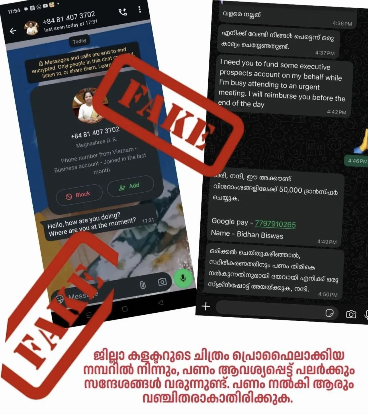 വയനാട് കലക്ടറുടെ പേരിൽ പണം ആവശ്യപ്പെട്ട് വാട്സ് ആപ്പ് സന്ദേശം: വയനാട് സൈബർ പോലീസ് കേസ് എടുത്തു