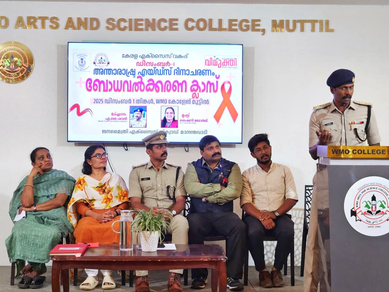 മുട്ടില്:അന്താരാഷ്ട്ര എയ്ഡ്സ് ദിനാചരണത്തിന്റെ ഭാഗമായി ജില്ലാ വിമുക്തി മിഷന് സംസ്ഥാന എയ്ഡ്സ് കണ്ട്രോള് സൊസൈറ്റിയുടെ സഹകരണത്തോടെ കോളേജ് വിദ്യാര്ത്ഥികള്ക്കായി ജില്ലാതല ബോധവത്കരണ ക്ലാസ്സ് സംഘടിപ്പിച്ചു. മുട്ടില് ഡബ്ല്യൂ.എം.ഒ കോളേജില് നടന്ന പരിപാടി ജില്ലാ ഡെപ്യൂട്ടി എക്സൈസ് കമ്മീഷണര് എ.ജെ ഷാജി റെഡ് റിബണ് നല്കി ഉദ്ഘാടനം ചെയ്തു. കോളേജ് പ്രിന്സിപ്പാള് ഡോ.വിജി പോള് അധ്യക്ഷനായ പരിപാടിയില് സോഷ്യല് വര്ക്ക് വിഭാഗം മേധാവി എം.എം അബ്ദുല് നിസാര്, ഐ.സി.ടി.സി കൗണ്സിലര് ഷൈനി ജോര്ജ്ജ്, വിമുക്തി മിഷന് ജില്ലാ കോ-ഓര്ഡിനേറ്റര് എന്.സി.സജിത്ത്കുമാര്, എക്സൈസ് ഇന്സ്പെക്ടര് യു.കെ ജിതിന്, അസിസ്റ്റന്റ് എക്സൈസ് ഇന്സ്പെക്ടര് കെ.കെ.ബാബു, കോളേജ് വിദ്യാര്ത്ഥികള് എന്നിവര് പങ്കെടുത്തു.