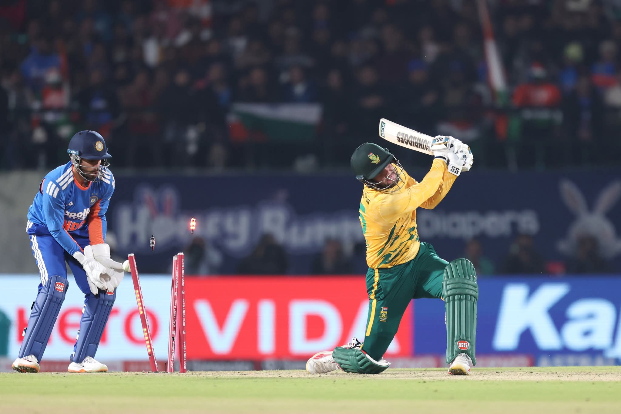ധരംശാലയിൽ ടോസ് നഷ്ടപ്പെട്ട് ബാറ്റിങ്ങിനെത്തിയ ദക്ഷിണാഫ്രിക്ക 20 ഓവറിൽ 117ന് പുറത്താവുകയായിരുന്നു. 46 പന്തിൽ 61 റൺസെടുത്ത ക്യാപ്റ്റൻ എയ്ഡൻ മാർക്രമാണ് ദക്ഷിണാഫ്രിക്കയുടെ ടോപ് സ്കോറർ. ഇന്ത്യക്ക് വേണ്ടി അർഷ്ദീപ് സിങ്, ഹർഷിത് റാണ, കുൽദീപ് യാദവ്, വരുൺ ചക്രവർത്തി എന്നിവർ രണ്ട് വിക്കറ്റ് വീതം വീഴ്ത്തി. രണ്ട് മാറ്റങ്ങളുമായിട്ടാണ് ഇന്ത്യ ഇറങ്ങിയത്. ജസ്പ്രിത് ബുമ്ര, അക്സർ പട്ടേൽ എന്നിവർക്ക് പകരം ഹർഷിത് റാണയും കുൽദീപ് യാദവും കളത്തിലിറങ്ങി. സഞ്ജു സാംസൺ തുടർച്ചയായ മൂന്നാം ടി20 മത്സരത്തിലും അവസരം ലഭിച്ചില്ല.