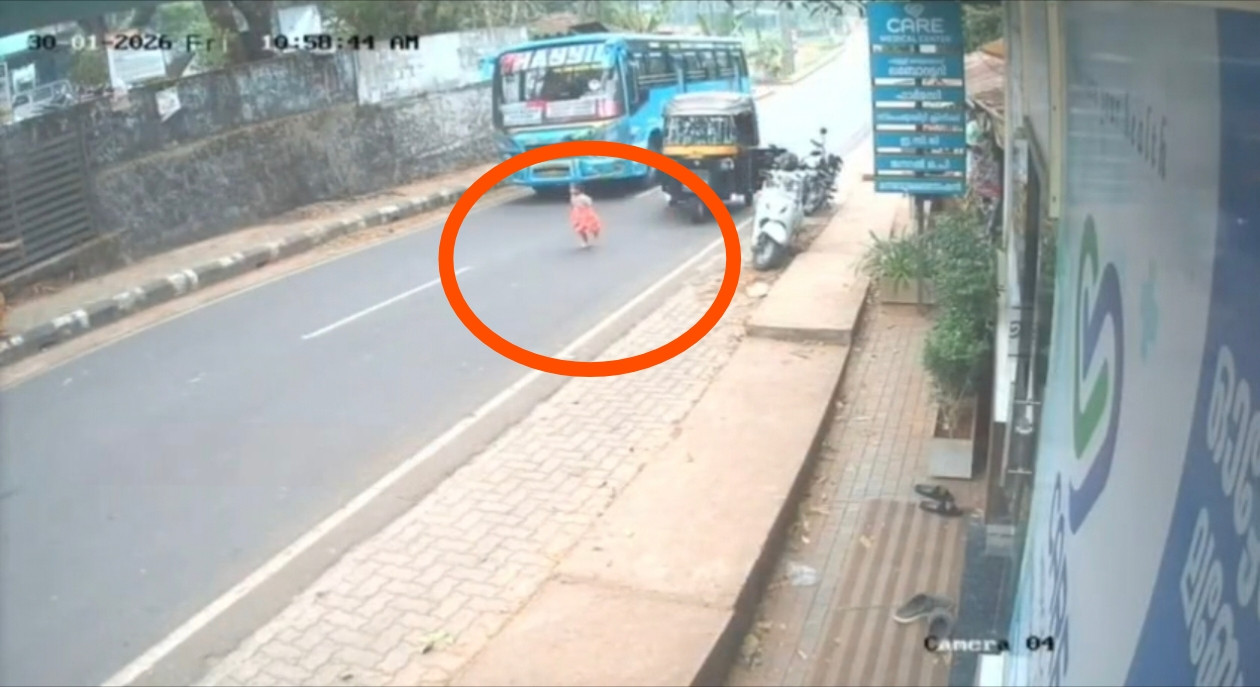 കോഴിക്കോട് നിന്ന് വരികയായിരുന്ന ബസിന് മുന്നിലേക്കാണ് കുട്ടി ഓടിയത്. അപ്രതീക്ഷിതമായി കുട്ടി ഓടിവരുന്നത് കണ്ട ബസ് ഡ്രൈവർ പെട്ടെന്ന് വലത്തേക്ക് തിരിച്ച് ബ്രേക്ക് ചവിട്ടിയതിനാൽ വലിയ ദുരന്തം ഒഴിവായി. ഈ സമയം കുട്ടി ബസിനരികിൽ നിന്ന് ഓടിമാറുന്നതും പുറത്തുവന്ന ദൃശ്യങ്ങളിൽ ഉണ്ട്. ഡ്രൈവറുടെ സമയോചിതമായ ഇടപെടലാണ് വലിയ അപകടം ഒഴിവാക്കിയത്.