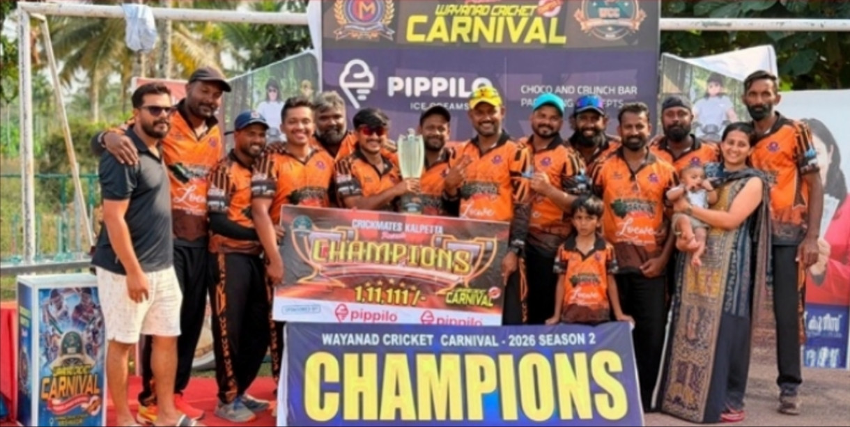 നീലഗിരി: ക്രിക്ക് മാറ്റ്സ് സംഘടിപ്പിച്ച ‘വയനാട് ക്രിക്കറ്റ് കാർണിവൽ’ ഓൾ വയനാട് ടെന്നിസ് ബോൾ ക്രിക്കറ്റ് ടൂർണമെന്റ് സീസൺ 2-ൽ ലെജൻഡ്സ് മീനങ്ങാടി ജേതാക്കളായി. നീലഗിരി കോളേജ് ഗ്രൗണ്ടിൽ അഞ്ച് ദിവസം നീണ്ടുനിന്ന ടൂർണമെന്റിൽ വയനാടിന്റെ വിവിധ ഭാഗങ്ങളിൽ നിന്നുള്ള ടീമുകൾ ആവേശത്തോടെ പങ്കെടുത്തു. ആവേശകരമായ ഫൈനൽ പോരാട്ടത്തിനൊടുവിൽ കപ്പുയർത്തിയ ലെജൻഡ്സ് മീനങ്ങാടിക്ക് 1,11,111 രൂപയുടെ പണസമ്മാനവും ട്രോഫിയും വിതരണം ചെയ്തു. പിപ്പിലോ ഐസ് ക്രീംസ്, എസ്ബിഐ ബാങ്ക്, എറണാട് കുറീസ് എന്നിവരായിരുന്നു ടൂർണമെന്റിന്റെ പ്രധാന സ്പോൺസർമാർ.