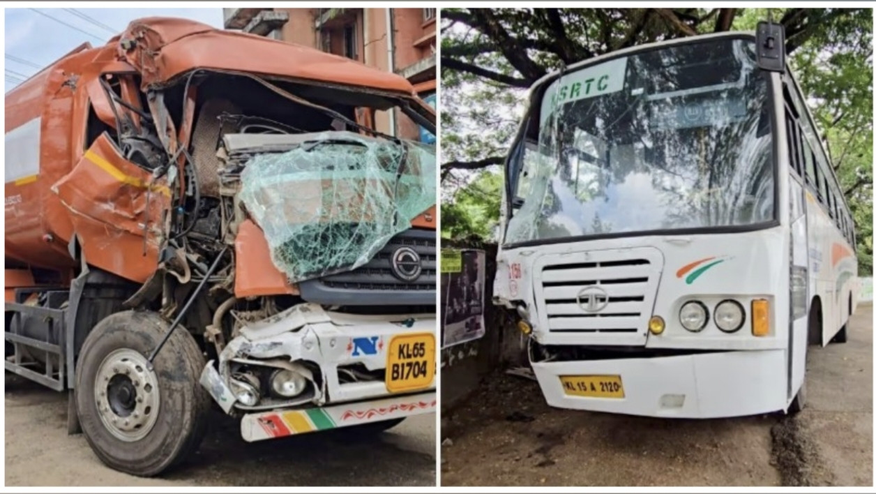 തൃശൂരിൽനിന്നും കോഴിക്കോട് ഭാഗത്തേക്ക് പോവുകയായിരുന്ന കെ.എസ്.ആർ.ടി.സി സൂപ്പർ ഡീലക്സ് ബസും കോഴിക്കോട് ഭാഗത്തുനിന്നും തിരുവനന്തപുരത്തേക്ക് പാമോയിൽ കയറ്റാനായി പോയ ടാങ്കർ ലോറിയുമാണ് കൂട്ടിയിടിച്ചത്. ഇടിയുടെ ആഘാതത്തിൽ ടാങ്കർ ലോറിയുടെ മുൻവശം പൂർണമായും തകർന്നു. ബസിന്റെ മുൻഭാഗത്തിനും ഭാഗികമായി തകർന്നിട്ടുണ്ട്. വേഗതയിൽ വന്നിരുന്ന ബസ് മുന്നിലെ കാറിൽ ഇടിക്കാതിരിക്കാനായി വെട്ടിച്ചപ്പോൾ നിയന്ത്രണംവിട്ട് എതിരെവന്ന ടാങ്കർ ലോറിയിൽ ഇടിക്കുകയായിരുന്നു.